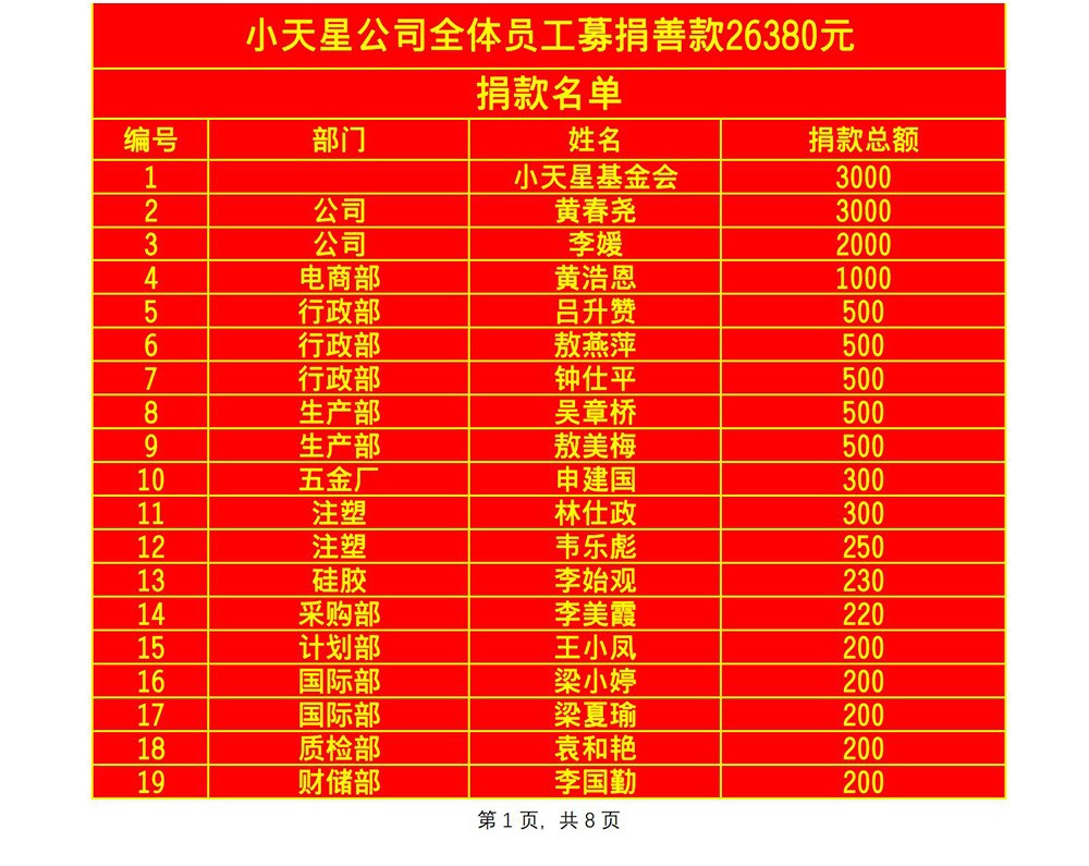 全体月薪同事线下募捐,更是从“小天星基金会”里捐出3000元,连平日里十分节省的